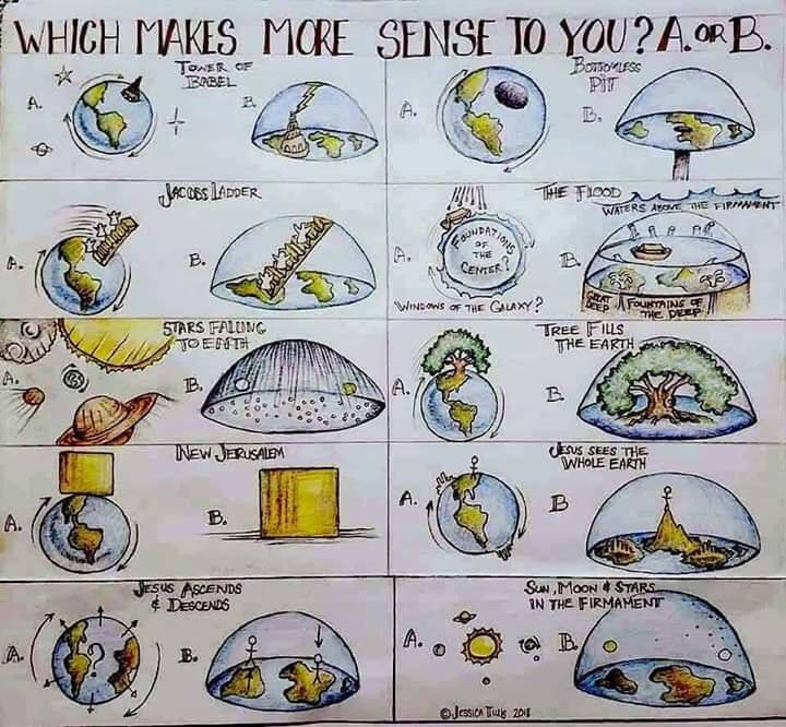 Een veel aangehaalde tekst om te bewijzen dat de aarde rond is en door het heelal zou bewegen is Job 26 : 7 waar staat “Hij hangt de aarde op aan het niets.” Deze tekst zegt helemaal niets over de vorm van de aarde: een halve aardappel met een dome erboven, een soort snowglobe, kan Hij ook in het niets hangen. Maar het zegt wel iets over "bewegen" : meestal als iets hangt blijft het stil-hangen, of op zijn hoogst heen en weer bewegen, maar het verandert niet van plaats. Wij weten dat er boven het hemelgewelf en onder de aarde zich water bevindt omdat de bijbel ons dat vertelt maar daarbuiten weten wij als mensen helemaal niets omdat wij daar nog nooit zijn geweest.